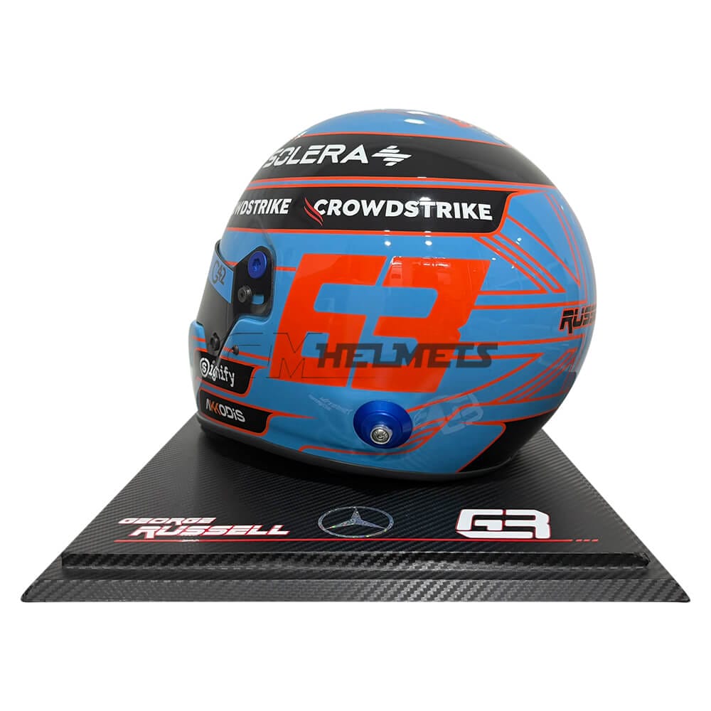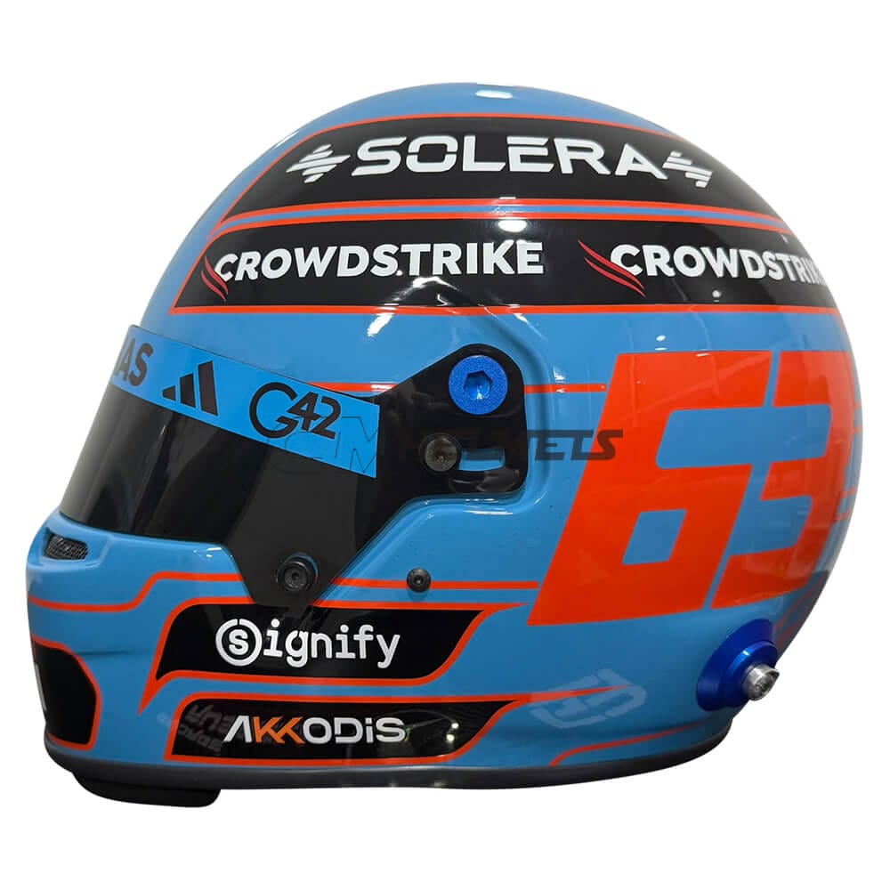 The helmet is painted in a beautiful light blue with orange details, such as Russell’s racing number (63) and the driver’s name on the back.