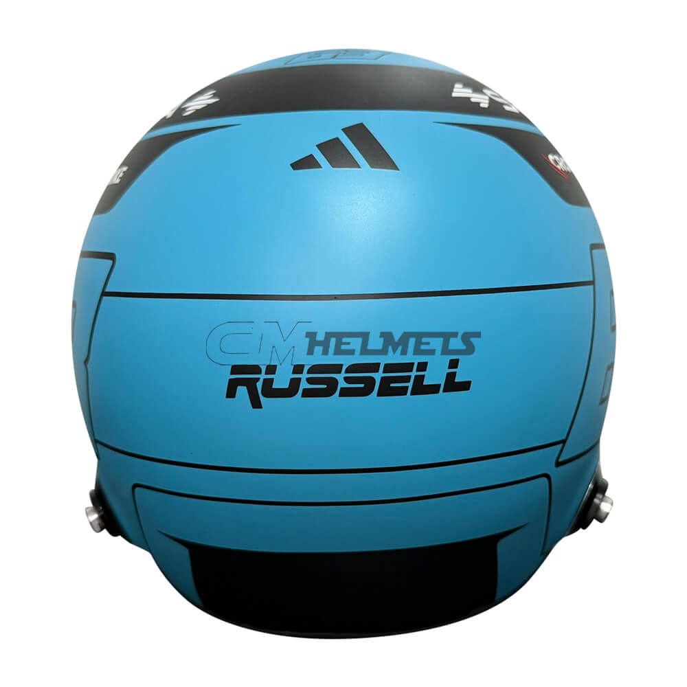 The helmet is painted in a beautiful light blue with black details, such as Russell’s racing number (63) and the driver’s name on the back.