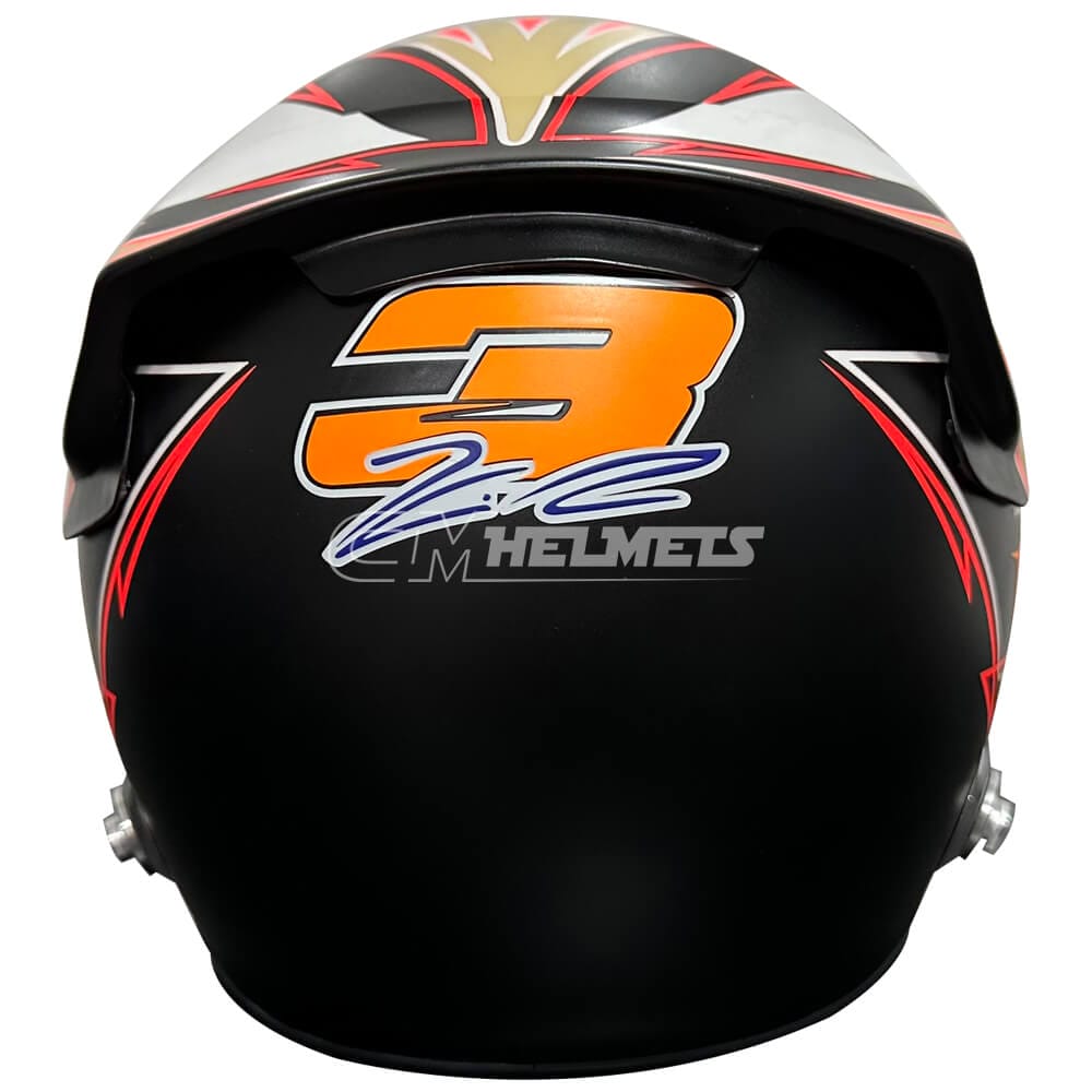 The back of the head protector includes a number 3 painted in orange and the Flying Finn’s signature in light blue, superimposed on the number.