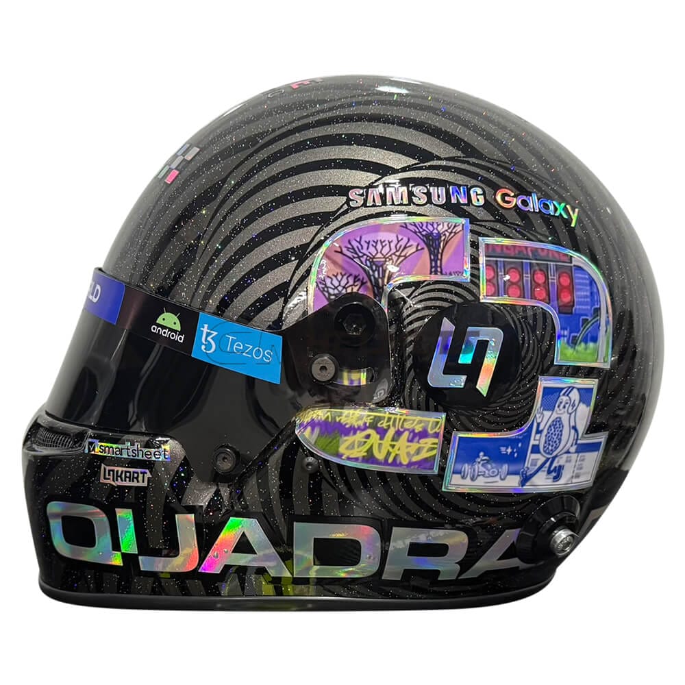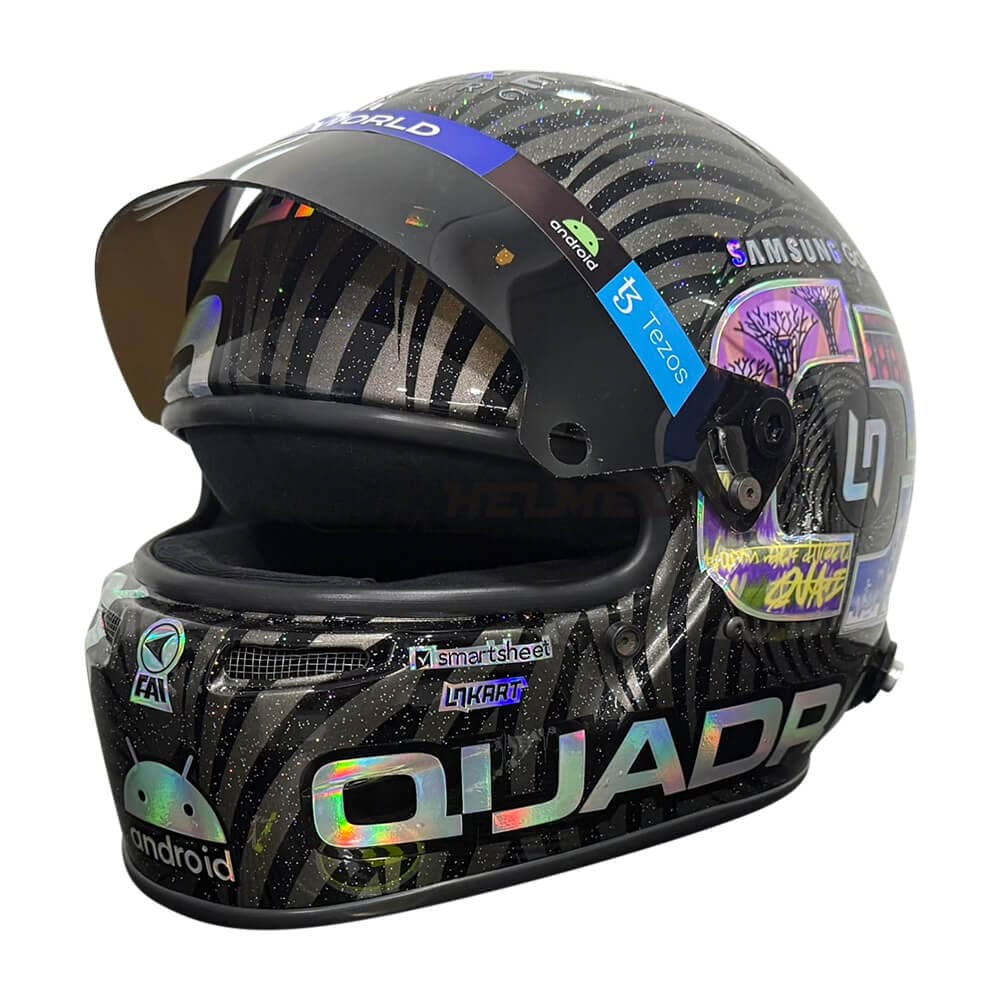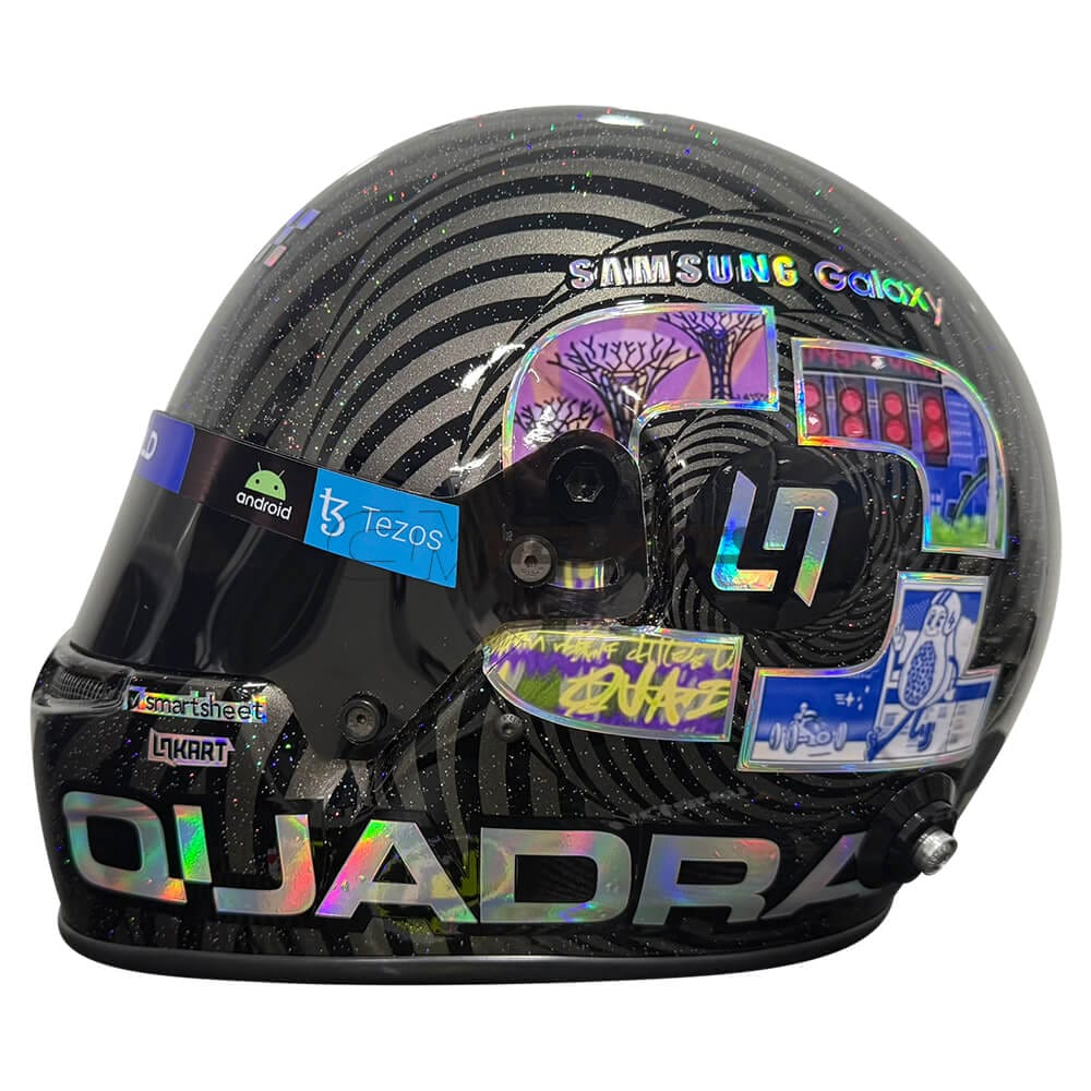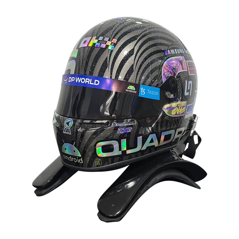 Norris, through his partnership with Quadrant (an esports team he founded), brought a unique helmet for the race in the Marina Bay Street Circuit. The helmet has a black base with several details in gray.