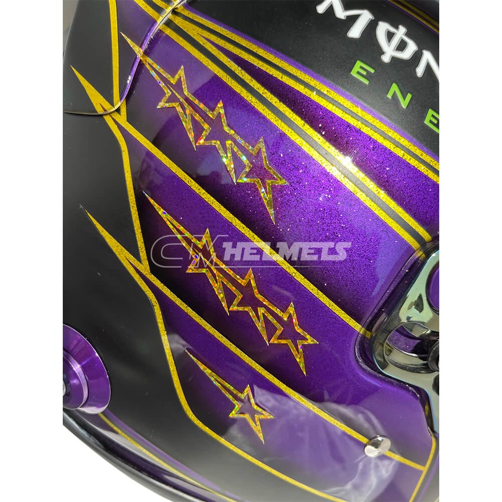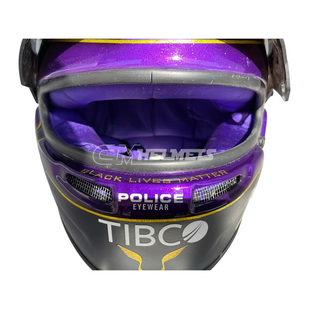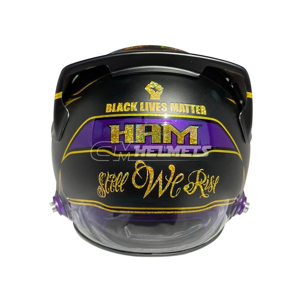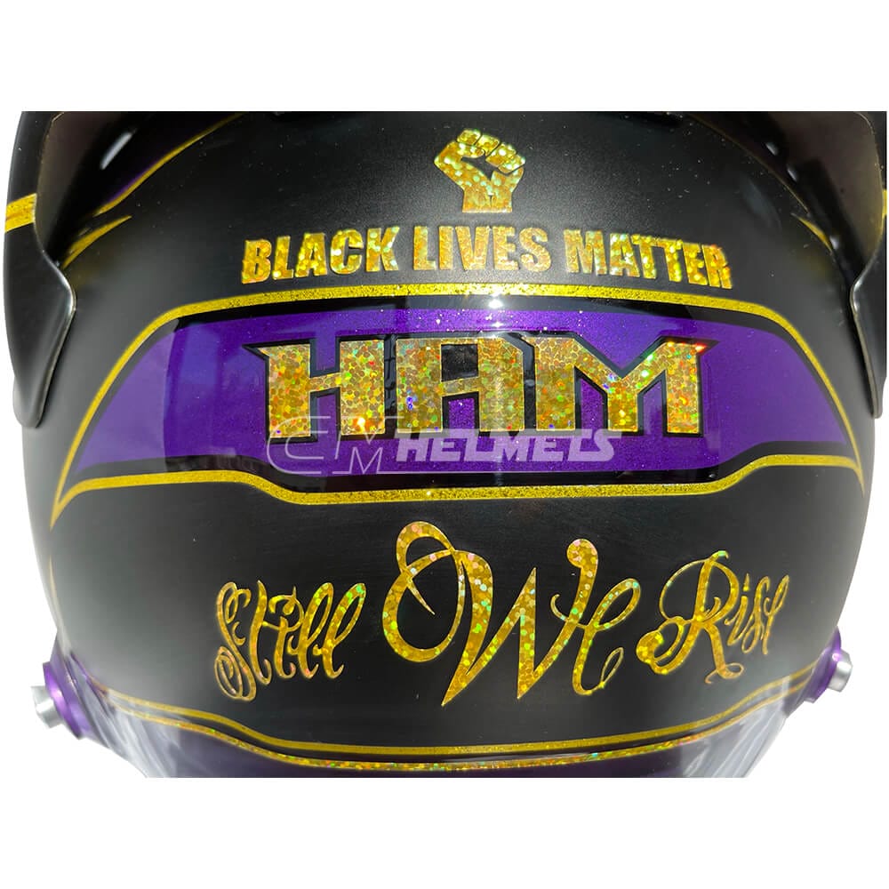This helmet is a replica of the one worn by Lewis Hamilton during the 2020 Abu Dhabi Grand Prix. The design is based on the purple helmet Hamilton used during the Barcelona test but was altered to black and purple to symbolize his fight against racism. The helmet also features the Black Lives Matter logo.