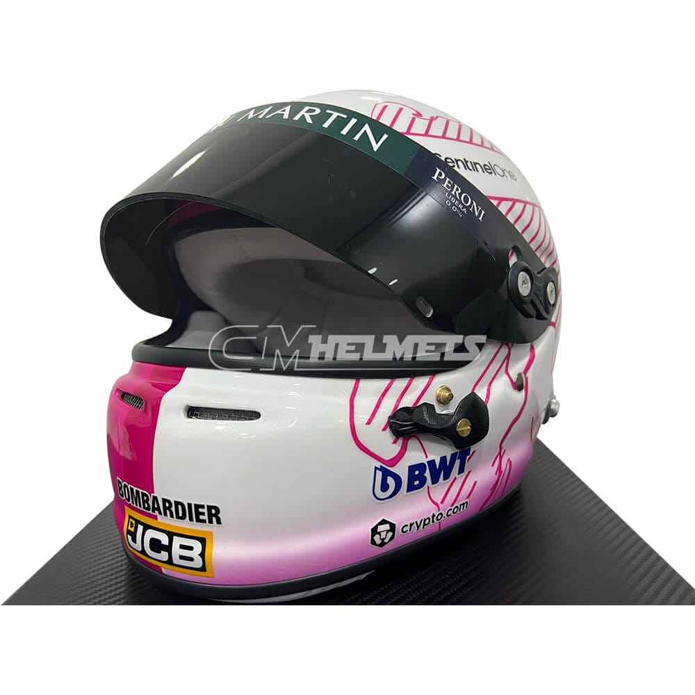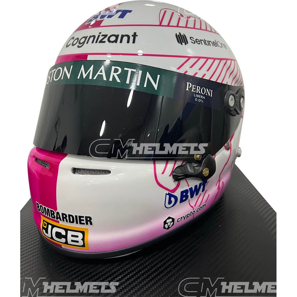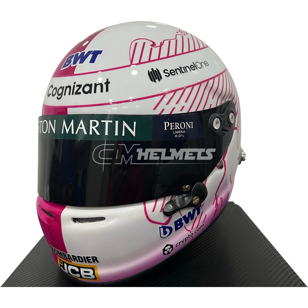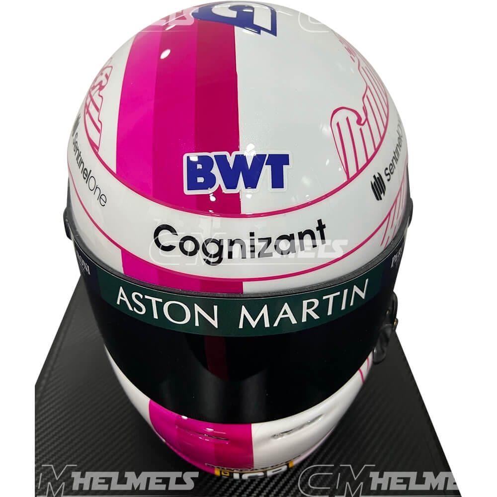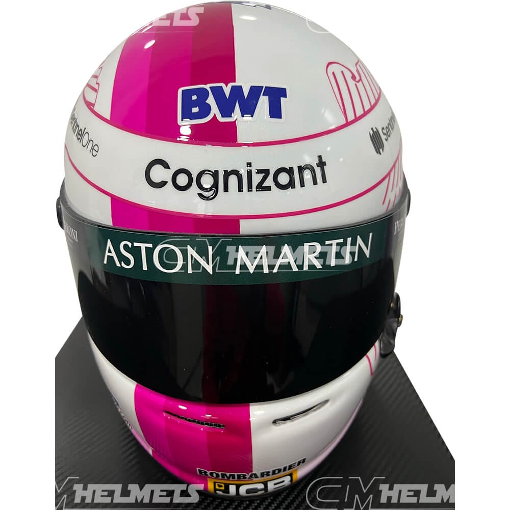 This is an exact replica of the pink helmet worn by four-time F1 World Champion Sebastian Vettel during some races of the 2021 season.