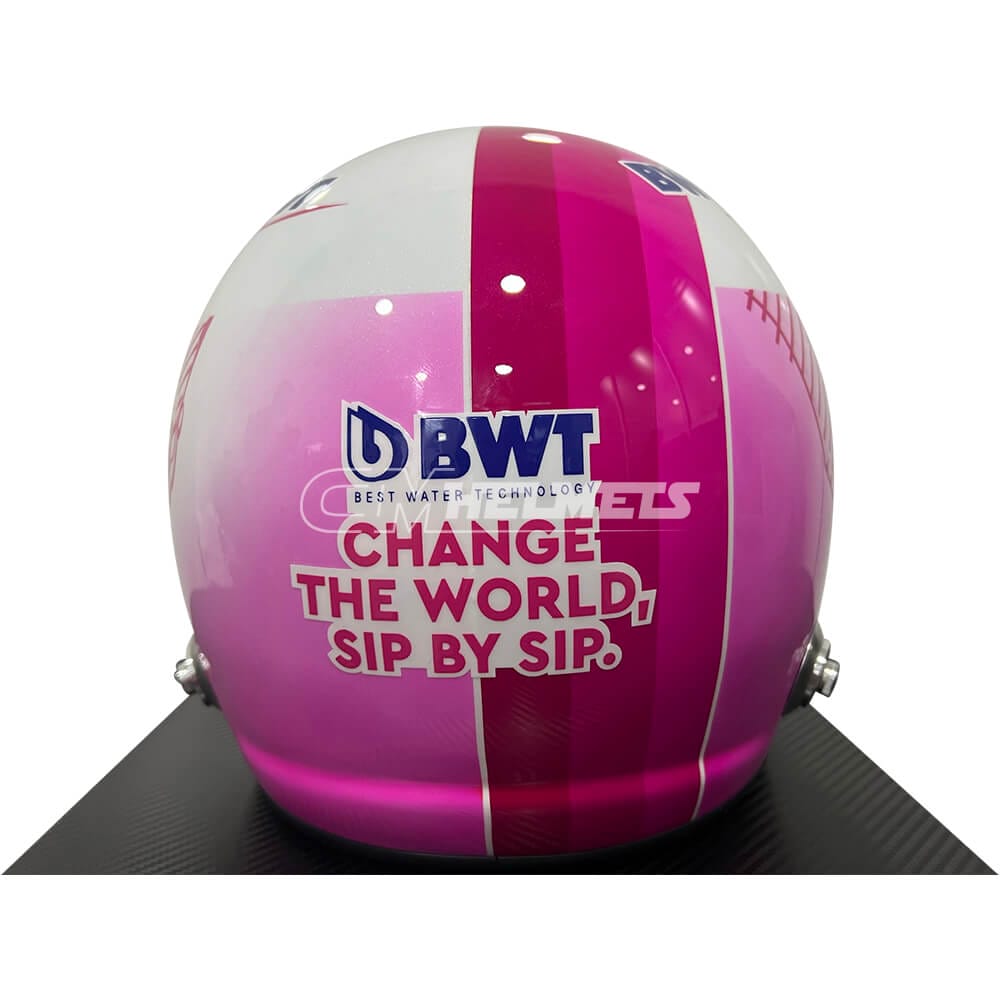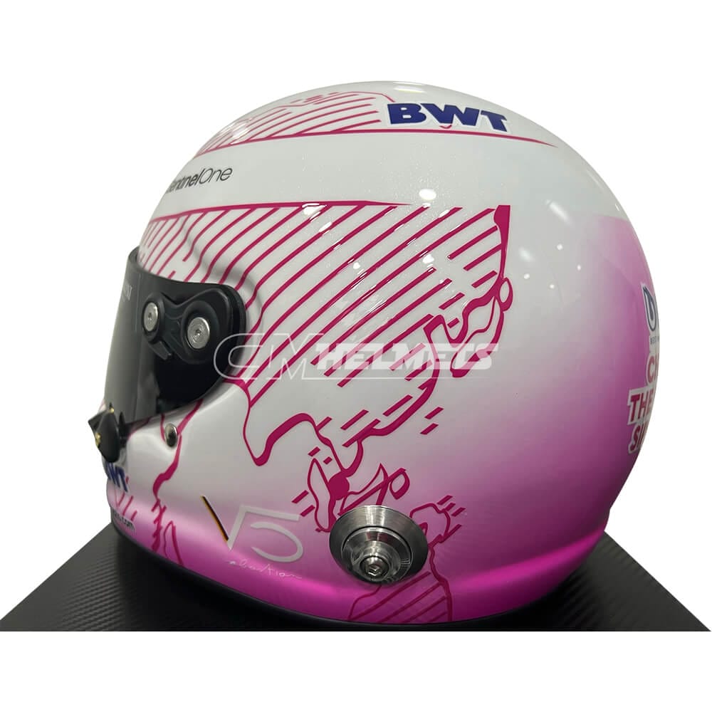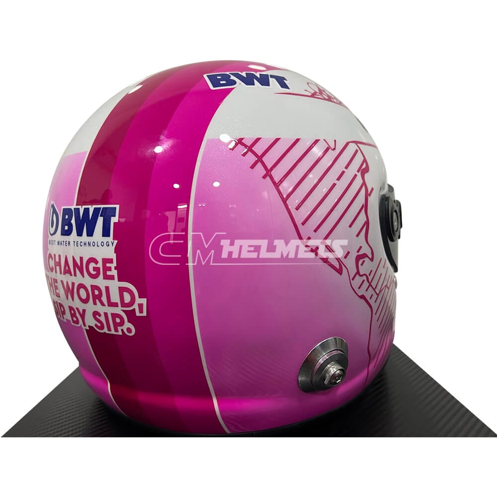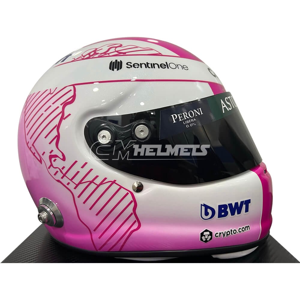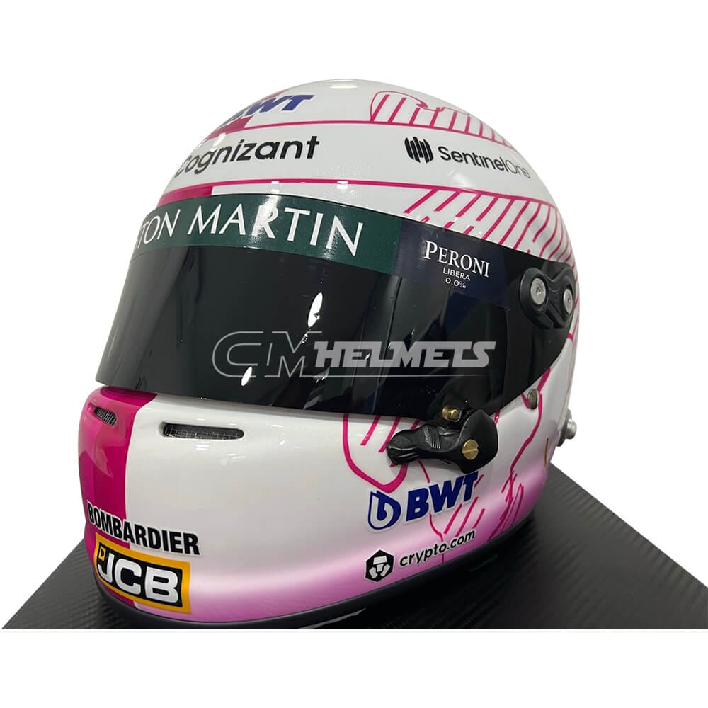 This is an exact replica of the pink helmet worn by four-time F1 World Champion Sebastian Vettel during some races of the 2021 season.